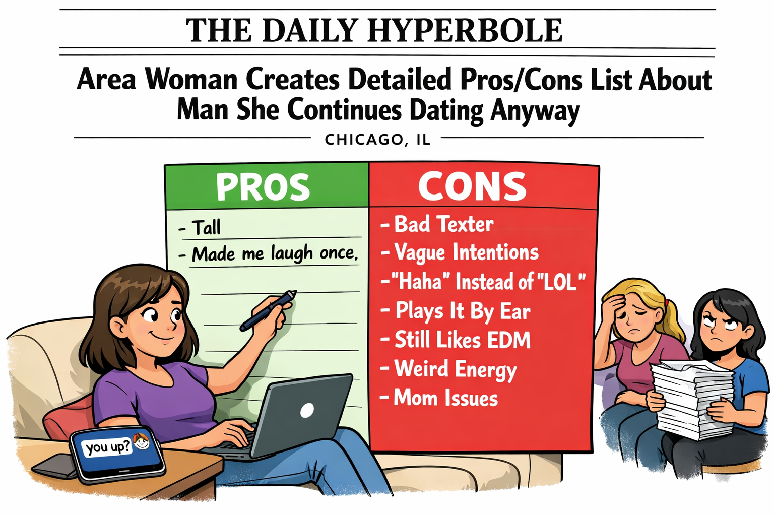 Area Woman Creates Detailed Pros/Cons List About Man She Continues Dating Anyway