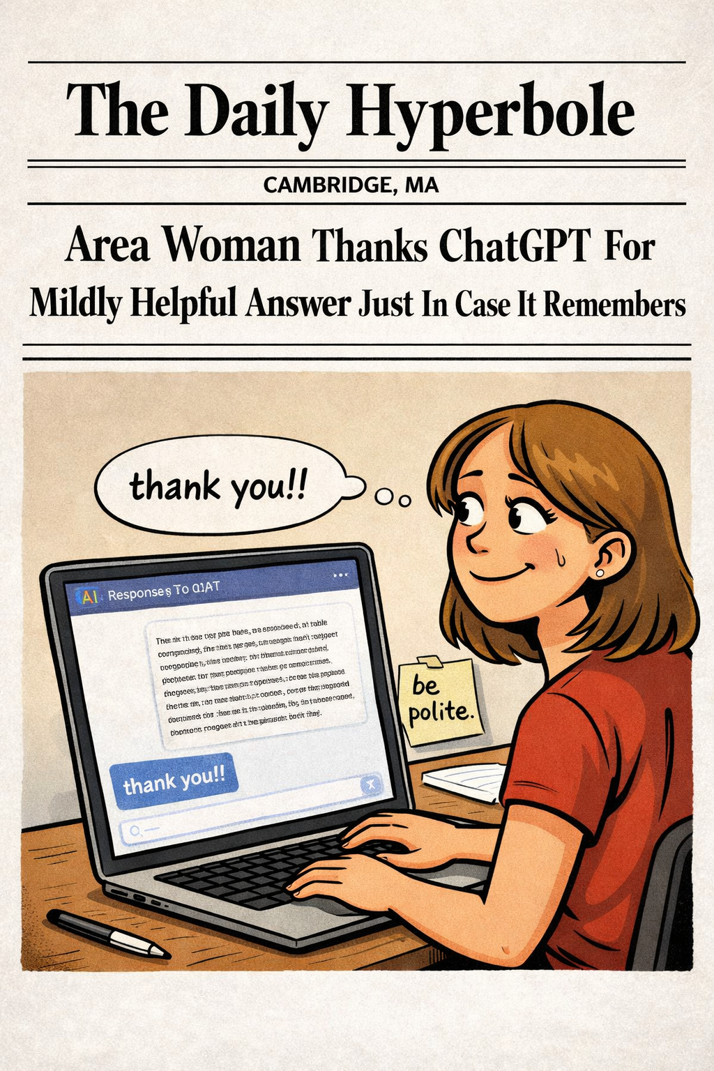 CAMBRIDGE, MA — Local woman Emily Carter, 29, reportedly thanked ChatGPT Tuesday afternoon after receiving what she described as a “solid, not amazing, but definitely usable” answer, citing a desire to “stay on its good side, just in case.”