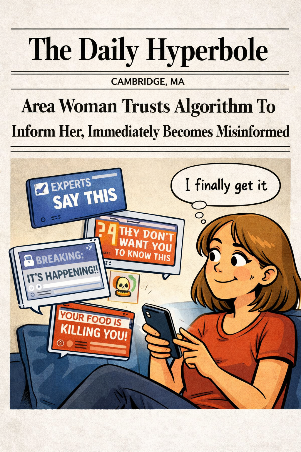 CAMBRIDGE, MA — Local woman Emily Carter, 29, reportedly placed full trust in her social media algorithm to keep her informed on current events Tuesday, before becoming “almost instantly and impressively misinformed” on multiple topics within minutes.