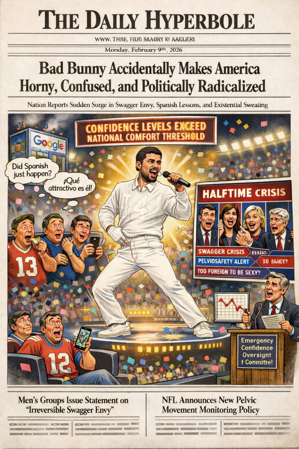 SANTA CLARA, CA — What began as a routine Super Bowl halftime show Sunday night quickly escalated into a nationwide episode of arousal, disorientation, and mild ideological collapse, after global pop star Bad Bunny took the field and — according to experts — “moved his hips with unacceptable confidence.”