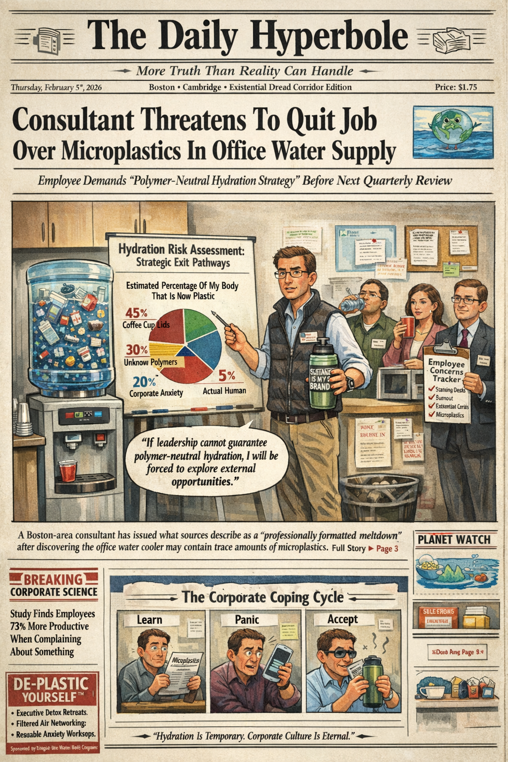 BOSTON, MA — A local management consultant has reportedly issued a formal and deeply color-coded ultimatum to company leadership, threatening to resign unless immediate action is taken regarding what he described as a “catastrophic microplastic infiltration event” occurring inside the firm’s office water cooler.