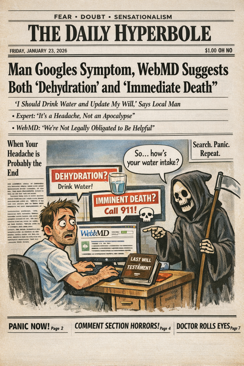 “WebMD is designed to cover all possibilities,” she explained. “Which means it includes everything from ‘you’re fine’ to ‘you’re dead.’ It’s like asking a Magic 8-Ball about your health, except the Magic 8-Ball is legally required to mention cancer.”