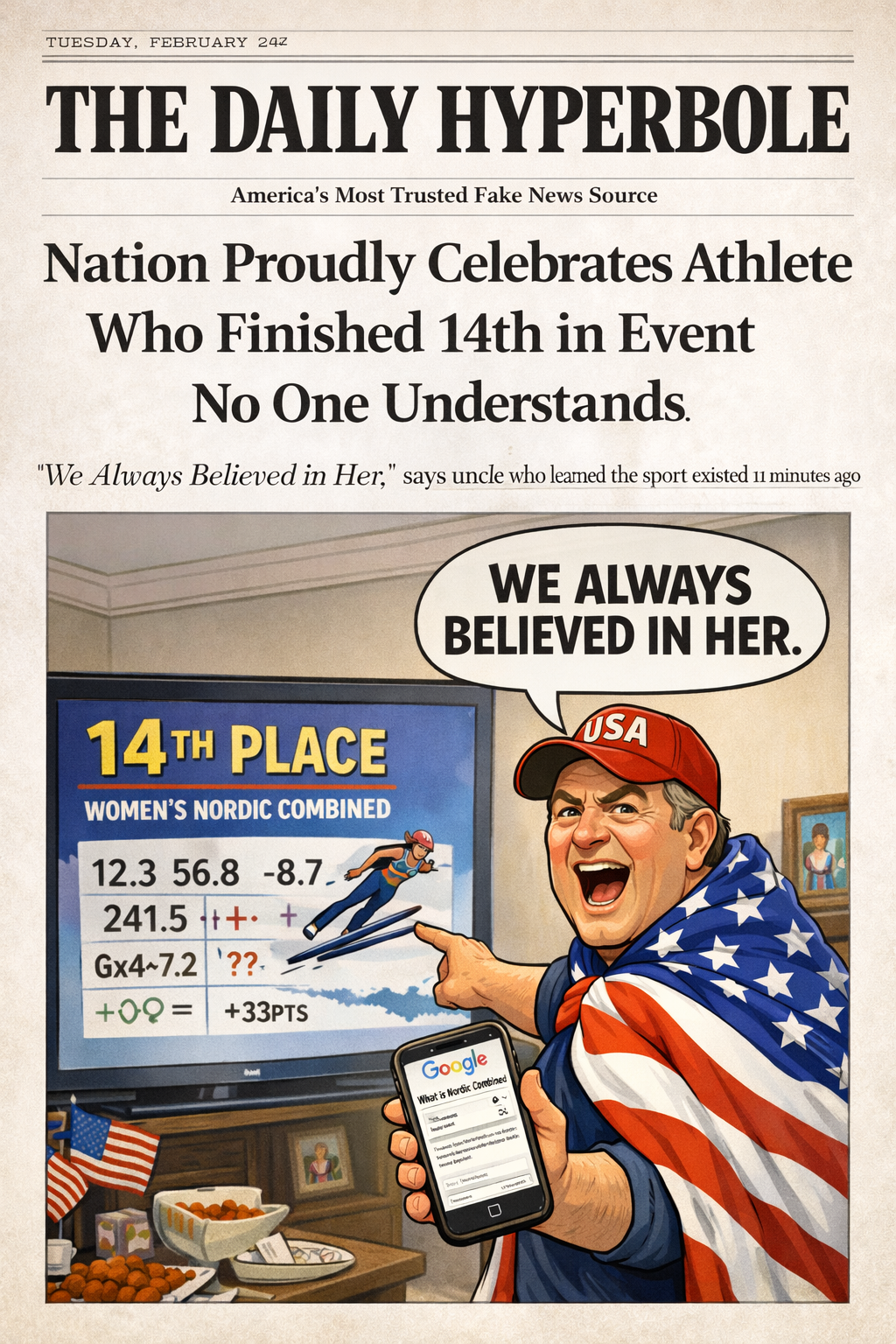 MILAN-CORTINA, ITALY — In an overwhelming display of national pride and selective understanding, the country erupted in celebration Tuesday after Olympic athlete Hannah Kessler secured a hard-fought 14th place finish in the women’s Nordic Combined Individual Sprint — an event experts confirm “definitely involves skis” and possibly “some sort of uphill situation.”