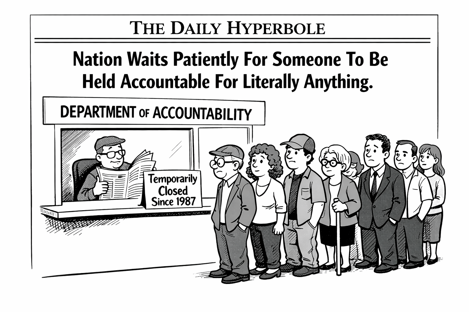 “I just figured eventually somebody would get in trouble,” said local resident Daniel Reeves while standing in what he described as the nation’s “long, invisible line for accountability.” “You know, like in school when someone messes up and the teacher asks who did it. Except now the teacher never comes back.”