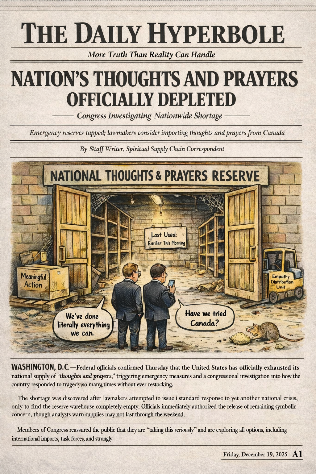 With domestic production stalled, lawmakers are now exploring the possibility of importing thoughts and prayers from Canada, citing that country’s surplus of politeness and unused compassion.