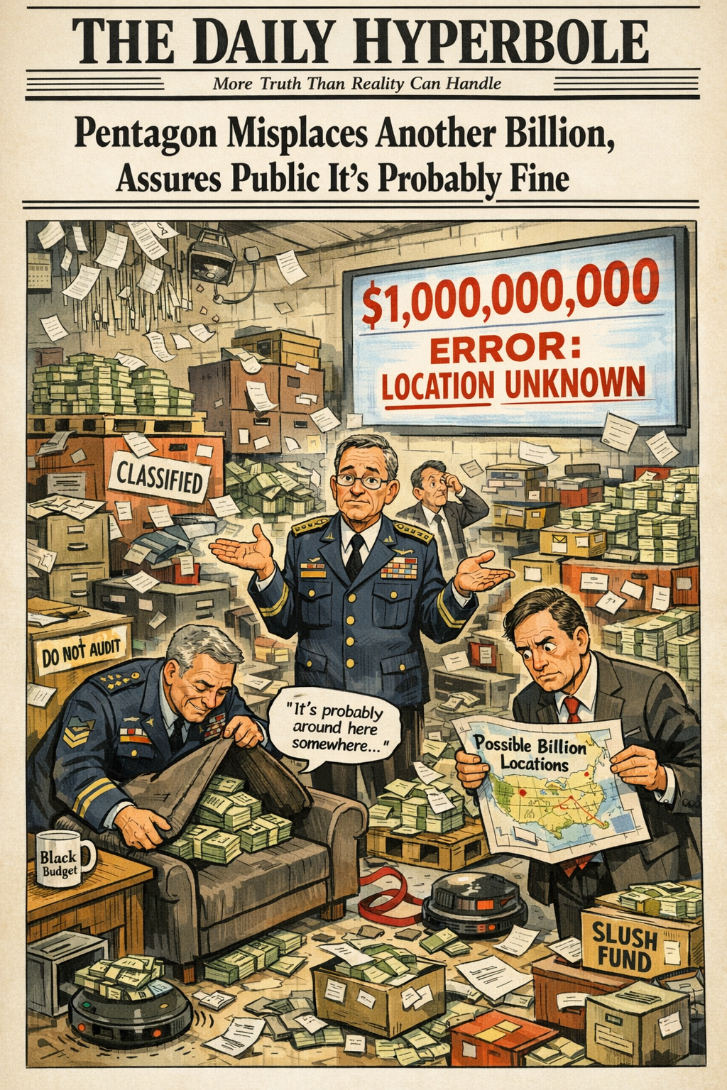 The Pentagon announced this week that it had once again failed to locate roughly $1 billion in taxpayer funds, a development officials described as “not ideal on paper” but “ultimately part of a broader tradition of very expensive ambiguity.”