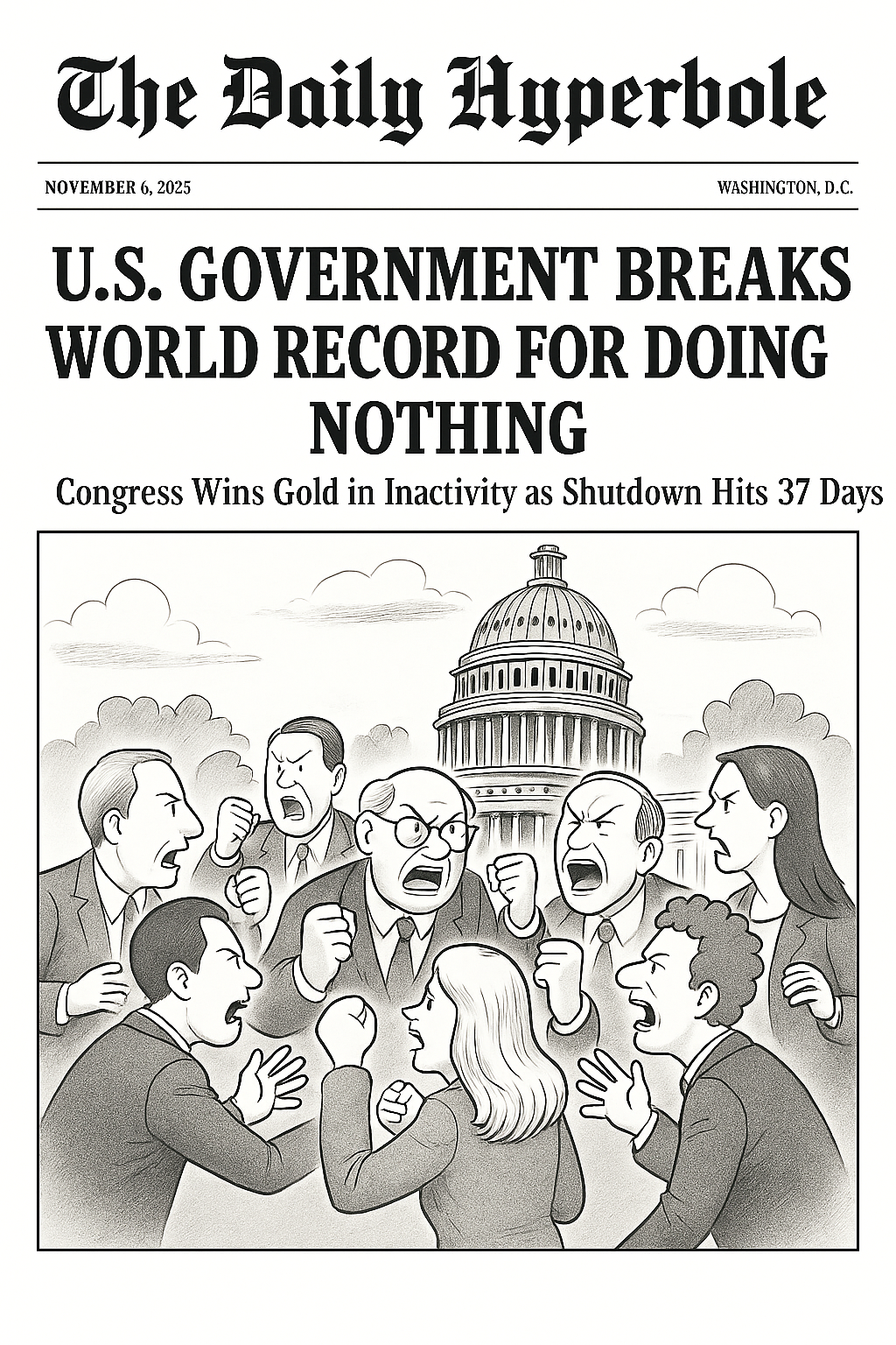 WASHINGTON — The U.S. government has officially set a new world record for “Longest Display of Dysfunction,” as the 2025 shutdown drags into its 37th day — surpassing the previous record from 2019 and cementing Congress’s status as the nation’s top productivity deterrent.